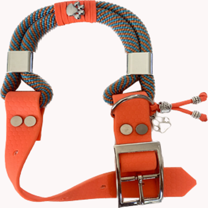 Collier sangle en biothane résistance à la rupture de 340 kg orange néon de 20 mm de large pour la taille M et de 25 mm de large pour les tailles L et XL + corde bicolore turquoise et orange néon de 10 mm de diamètre, les accessoires sont de la couleur argentée.